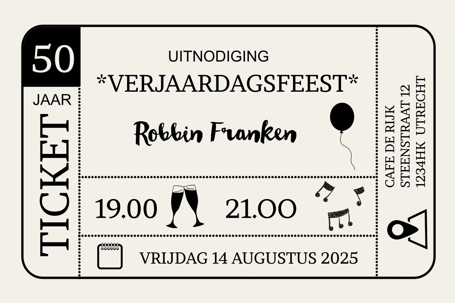 Stoere en originele ticketkaart 50e verjaardag met geheel aanpasbare tekst en achtergrond. (3198)