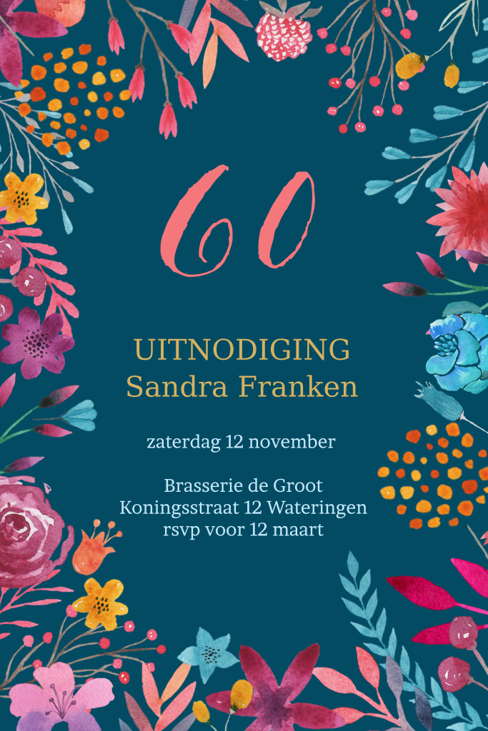 Verjaardagfeest 60 jaar met waterverf bloemen. (7558)