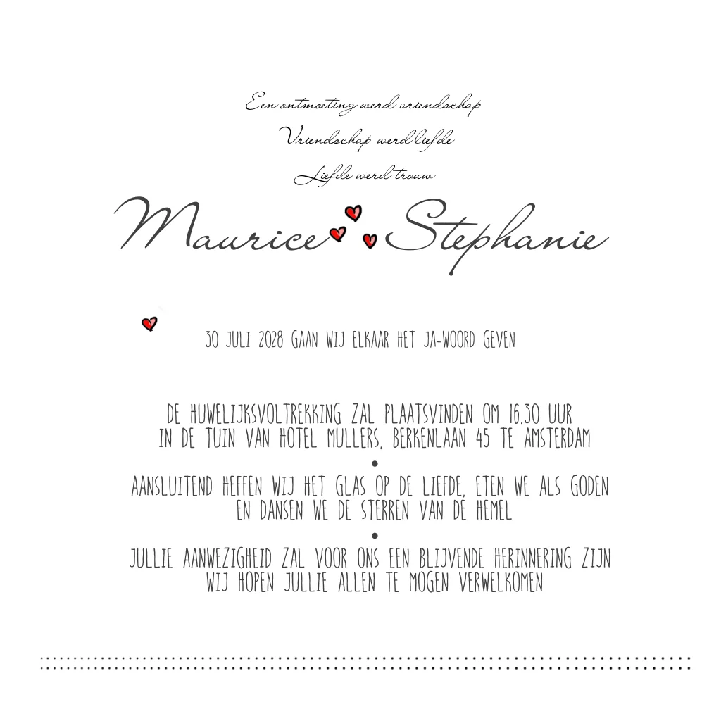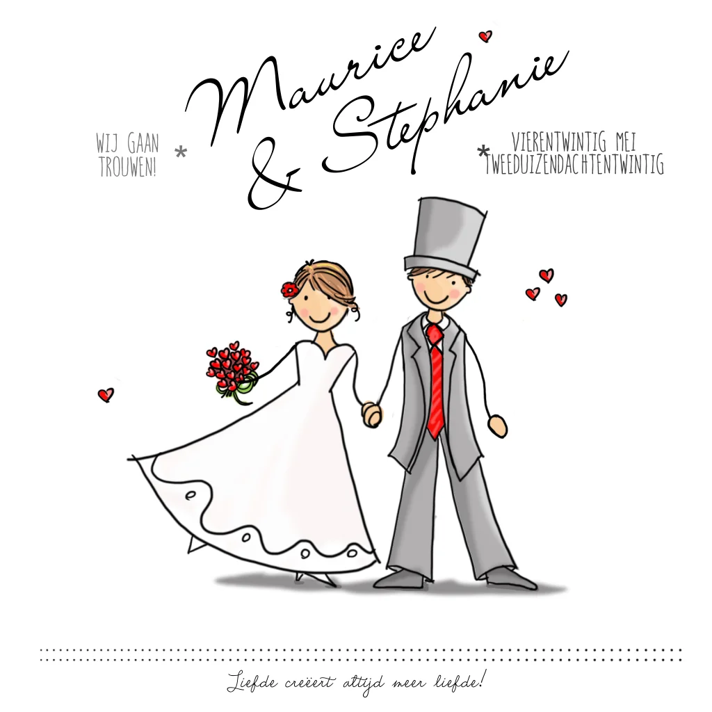 Leuk getekende huwelijkskaart met bruidspaar met rode hartjes en aanpasbare teksten. (2814) Willen jullie de tekening aangepast hebben zodat het meer op jullie lijkt? Vaak is dat mogelijk, neem daarvoor contact met ons op.