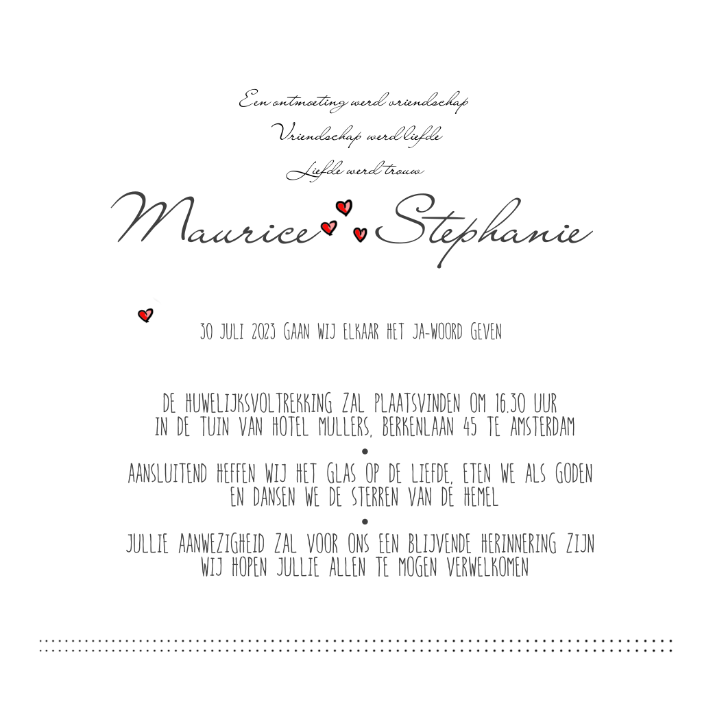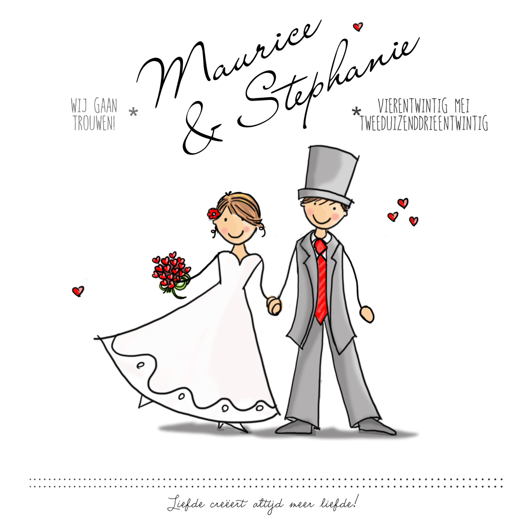 Leuk getekende huwelijkskaart met bruidspaar met rode hartjes en aanpasbare teksten. (2814)