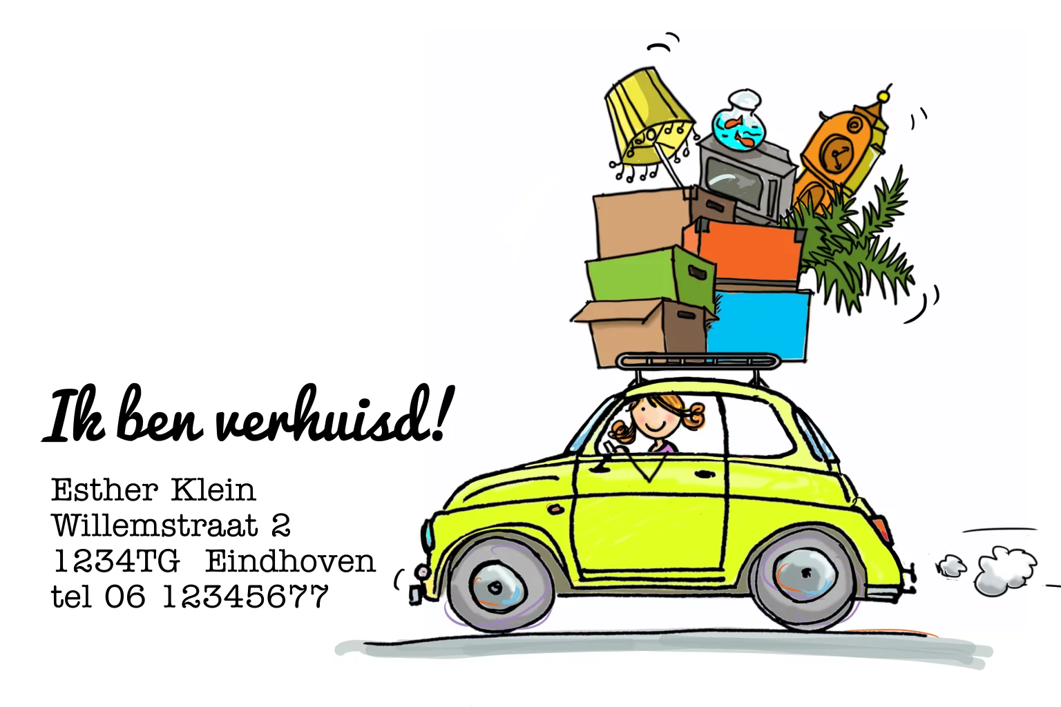 Vrolijke getekende verhuiskaart met gele fiat 500 en dame