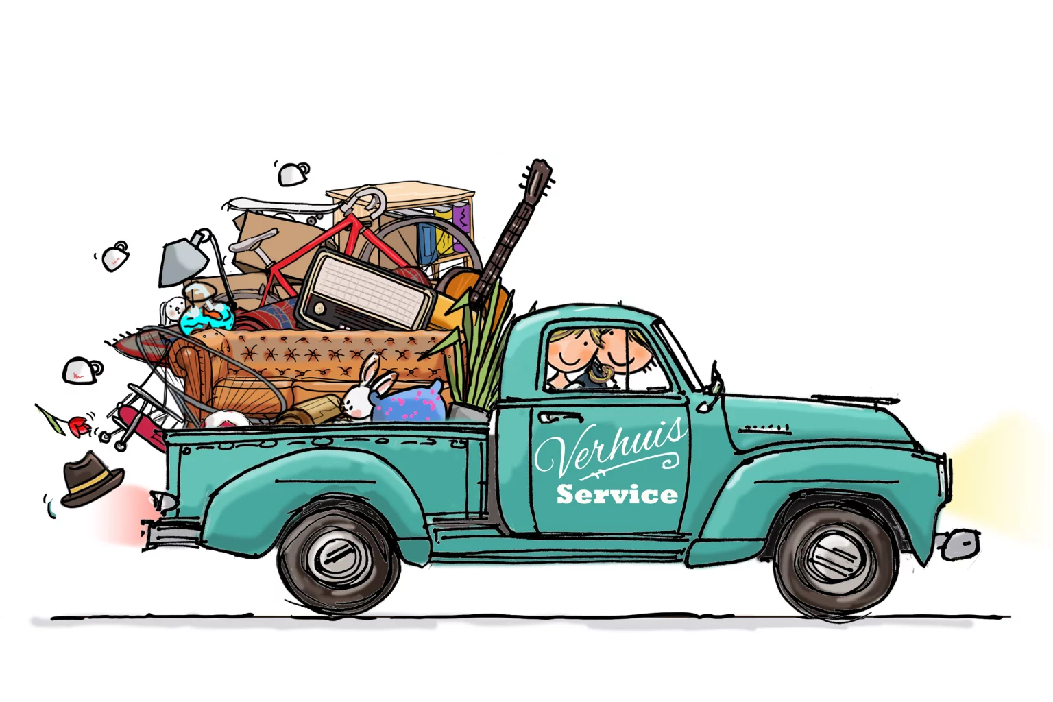 Vrolijke getekende verhuiskaart met groene buck met stel. Op een witte achtergrond. (2397)