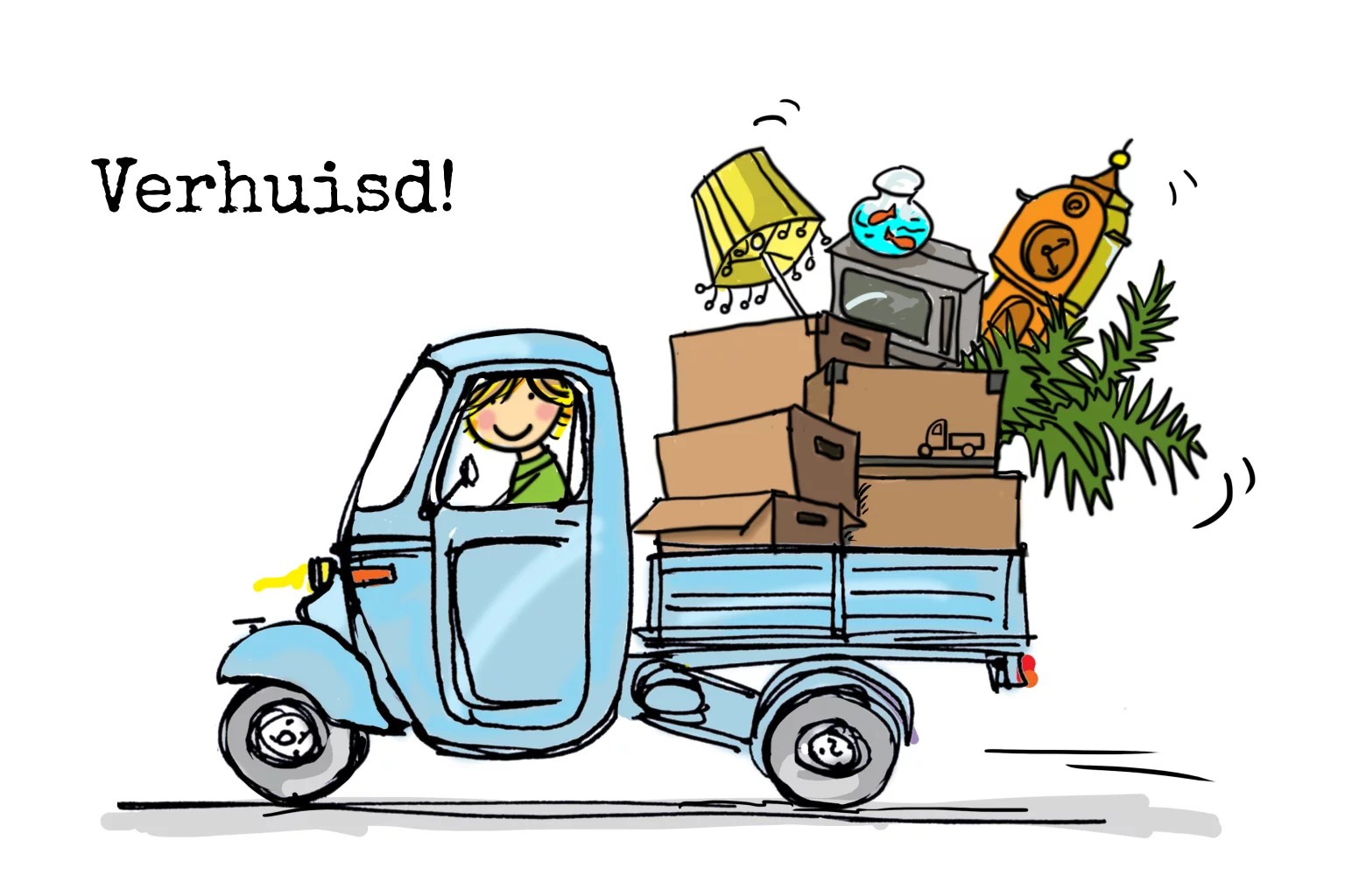 Getekende verhuiskaart met licht blauwe oldtimer vespa ape met inboedel in de bak. Met witte achtergrond. (2386)