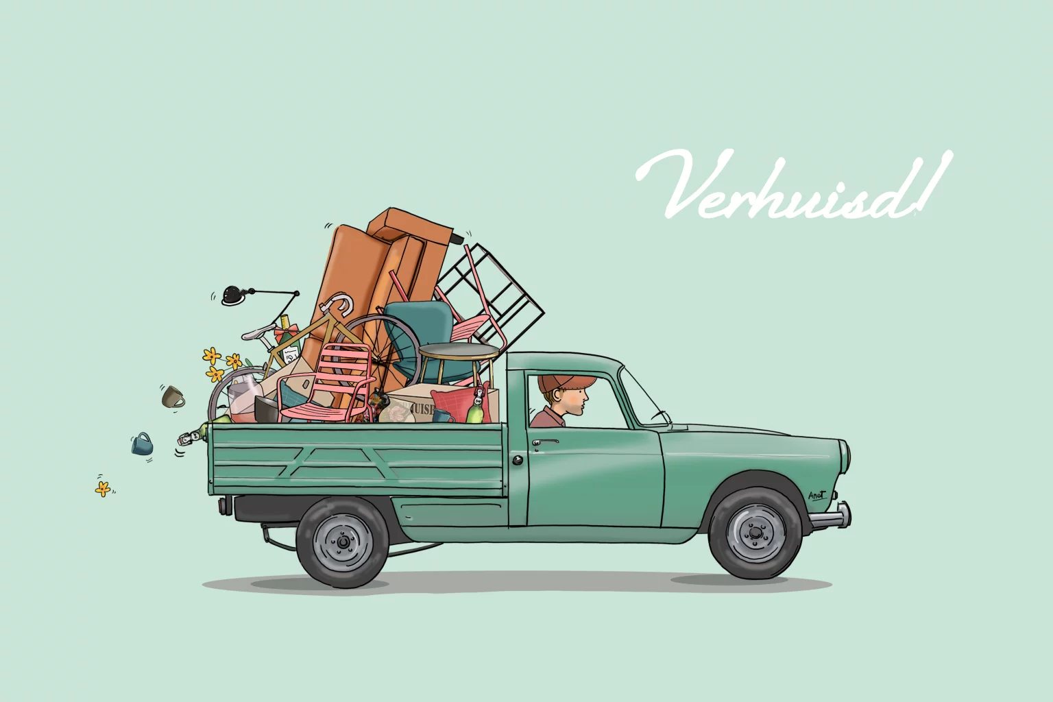 Vrolijke getekende verhuiskaart met Peugeot 404