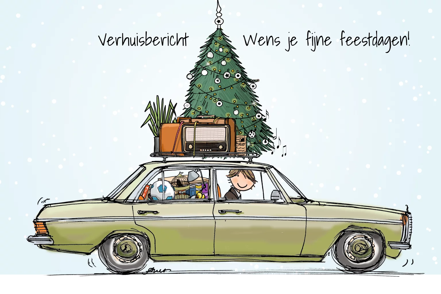 Vrolijke getekende kerst verhuiskaart maken met stoere mercedes. Op een kerst achtergrond met sneeuw en kerstboom getekend door Anet. (2572)