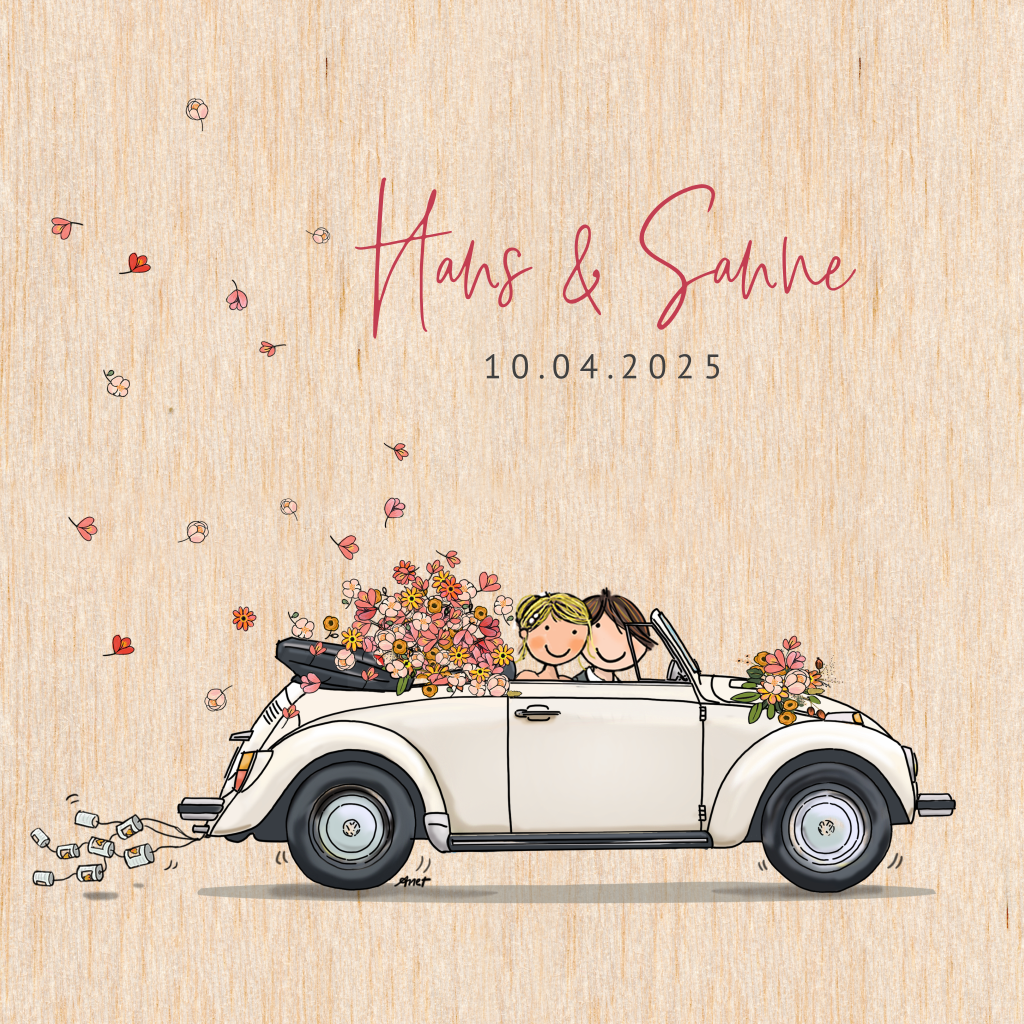 Vrolijke houten trouwkaart met trouwauto en bloemen