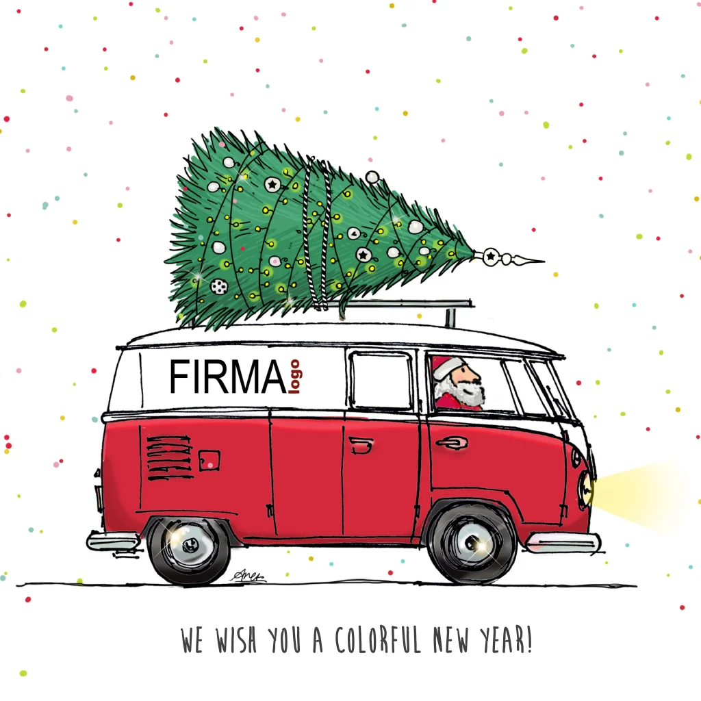 Zakelijke kerstkaart van volkswagen busje met reclame logo