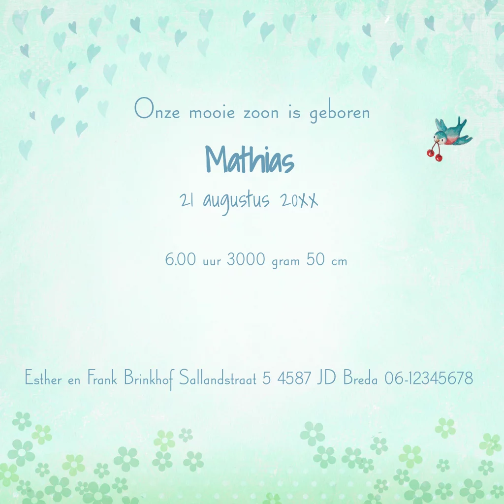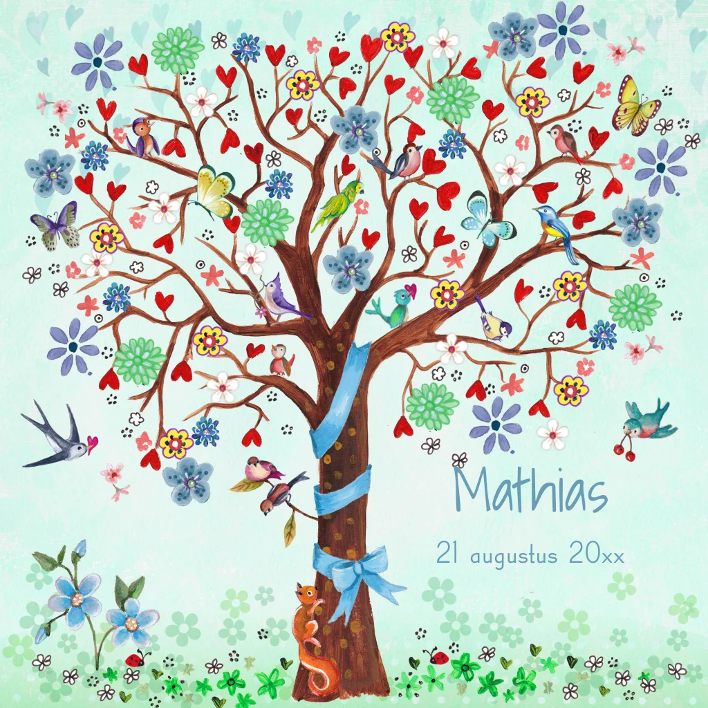 Jongens geboortekaartje met boom en blauw lintje. Pastel groene achtergrond. Boom met vlinders, vogels en eekhoorn. (88)