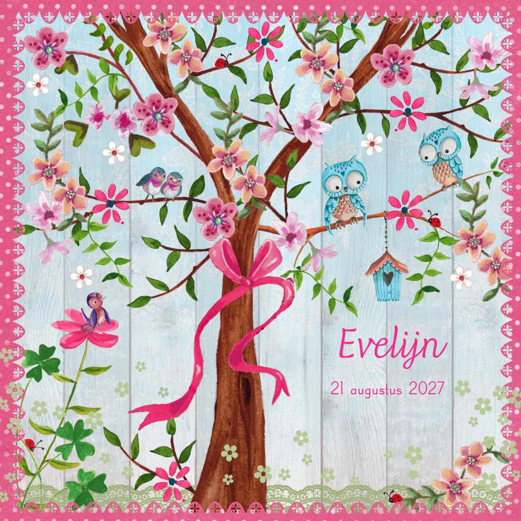 Geboortekaartje meisje met lichtblauw hout en boom met felroze strik. Lieve blauwe uiltjes en roze, zalmkleurige bloemen. (91)
