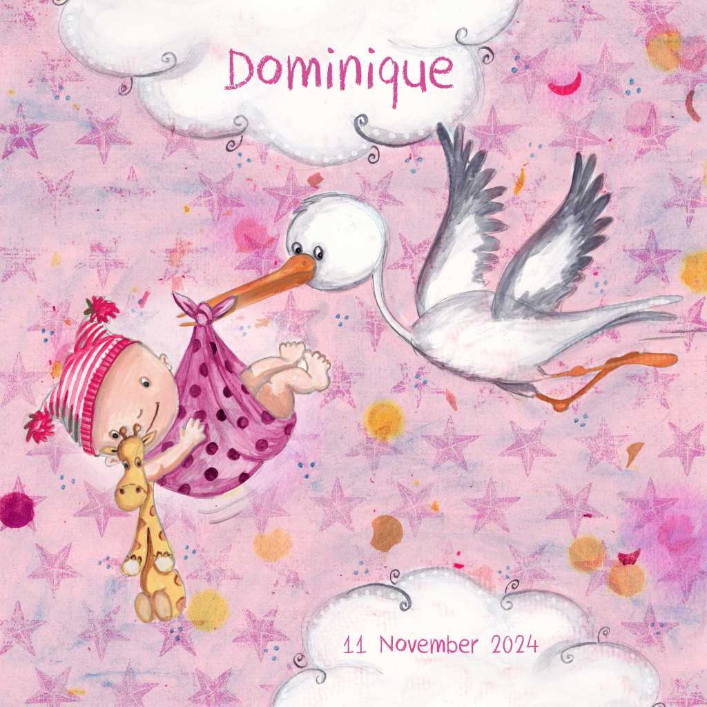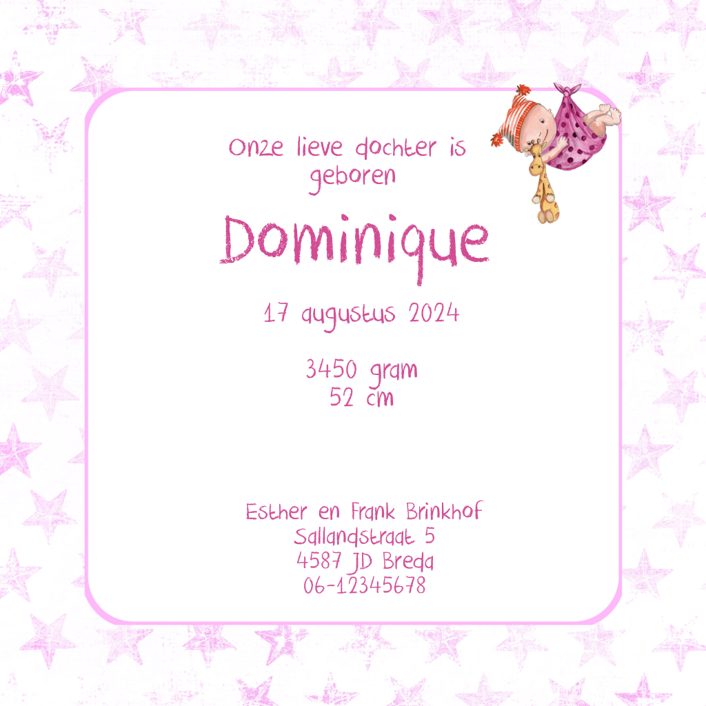 Lief geboortekaartje meisje. Licht roze achtergrond met sterretjes en witte wolkjes