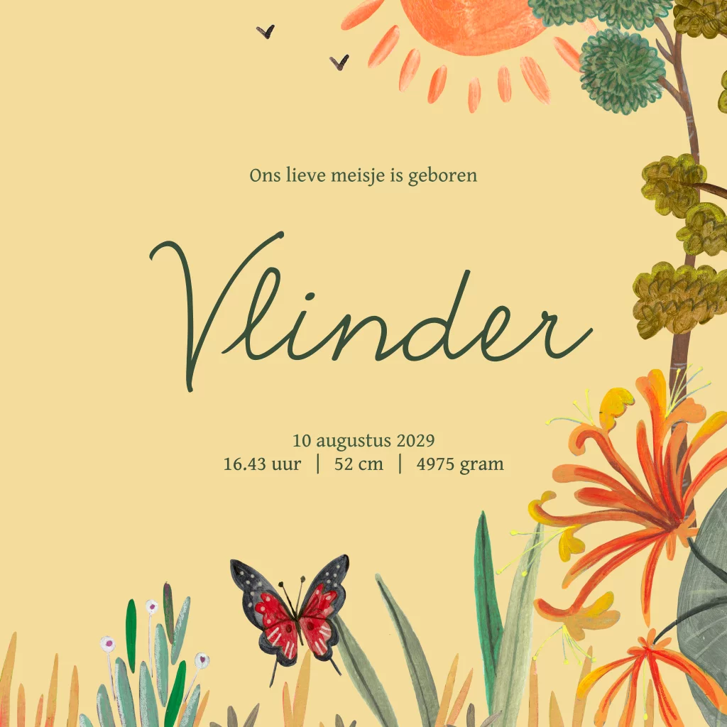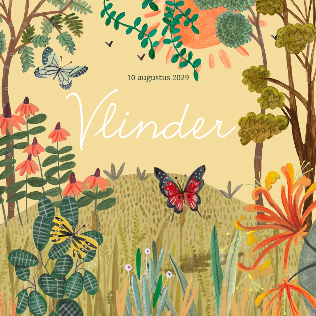 Schattig geboortekaartje met een savanne landschap in natuurlijke gele aardetinten vol bomen, bloemen en vlinders, naam van je kindje onder de zon. (999999)