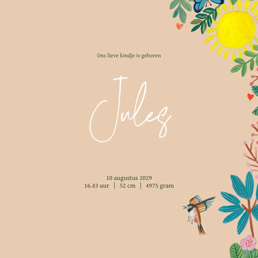 Een schattig getekend geboortekaartje voor een jongen of een meisje met een boom vol met appels en bloemen een uil in de boom en een zon straalt, een vogel vliegt. (999999)