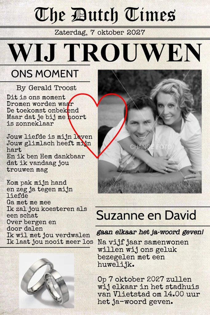 Trouwkaart krant met eigen foto op krantenpapier
