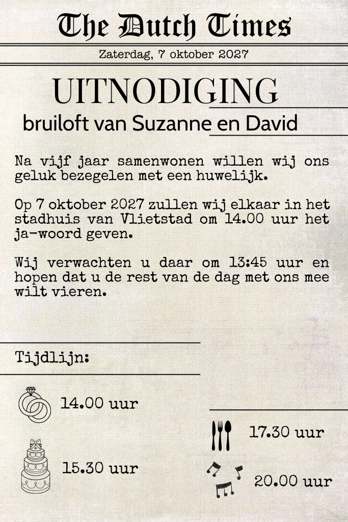 Originele trouwkaart / uitnodiging voor een huwelijk als een eigen krant / krantenartikel.