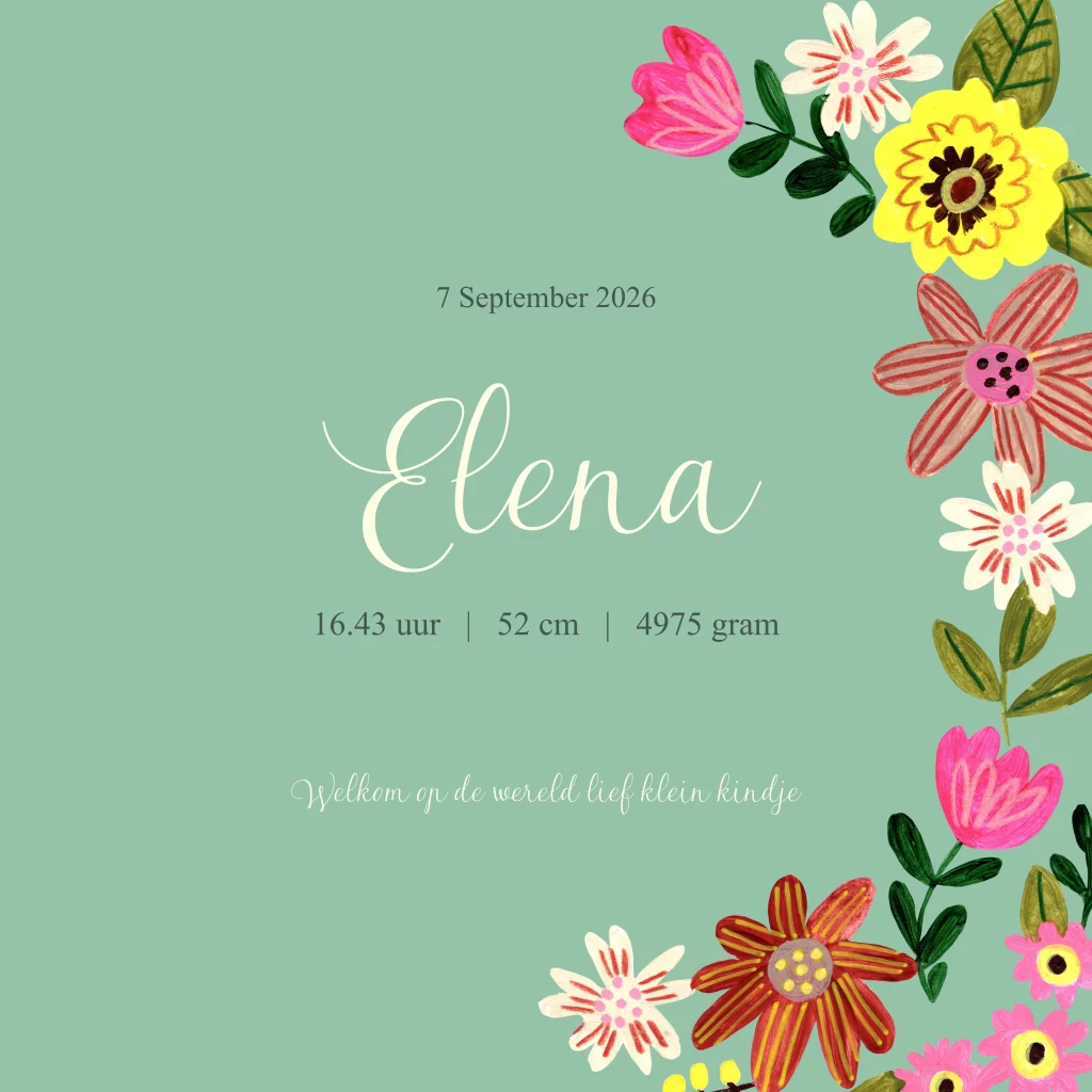 Een kleurrijk meisjes geboortekaartje met vrolijke kleurrijke bloemen en plaats voor een foto in een boog. (24146)