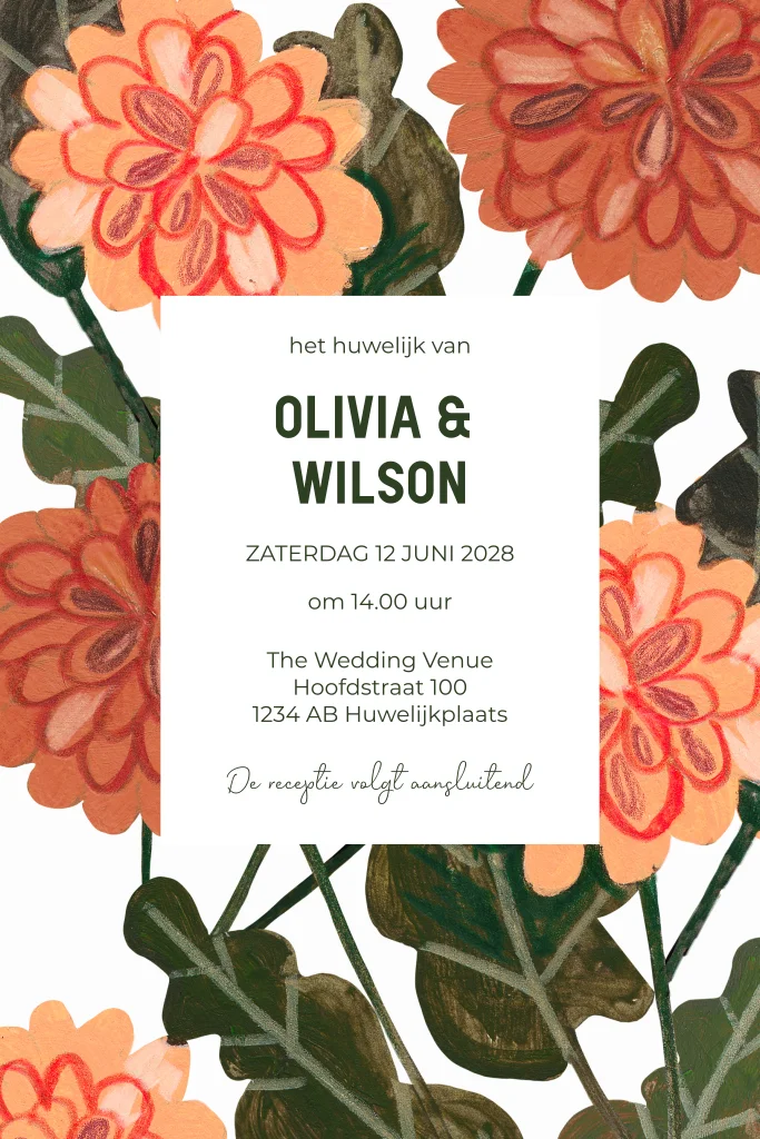 Een mooie hand geschilderde trouwkaart met geschilderde bloemen in een peach oranje met groen. (24155)