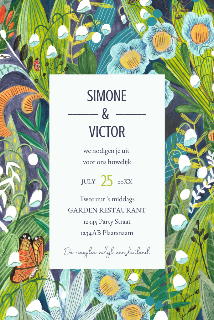 Een prachtige originele trouwkaart met handgeschilderde en getekende bloemen. Voor een huwelijk in blauw groen botanisch of bohemian thema. (24160)