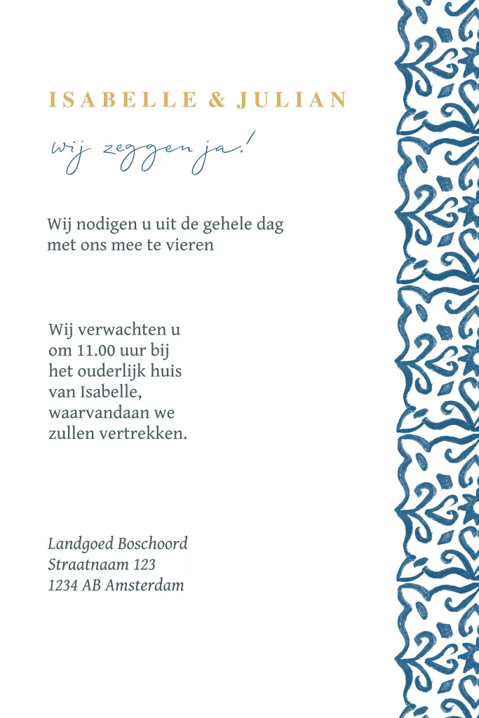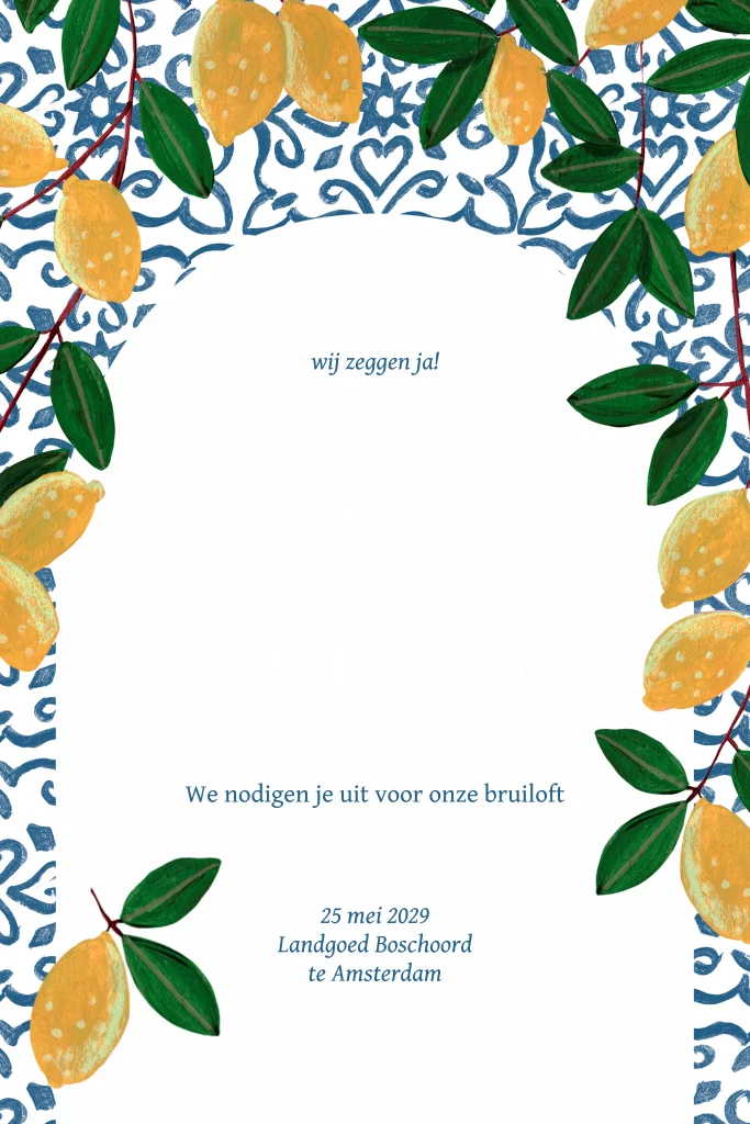 Een moderne trouwkaart met mediterraanse tegels rond een boog met citroenen. Leuk voor strand en Italië thema. (999999)