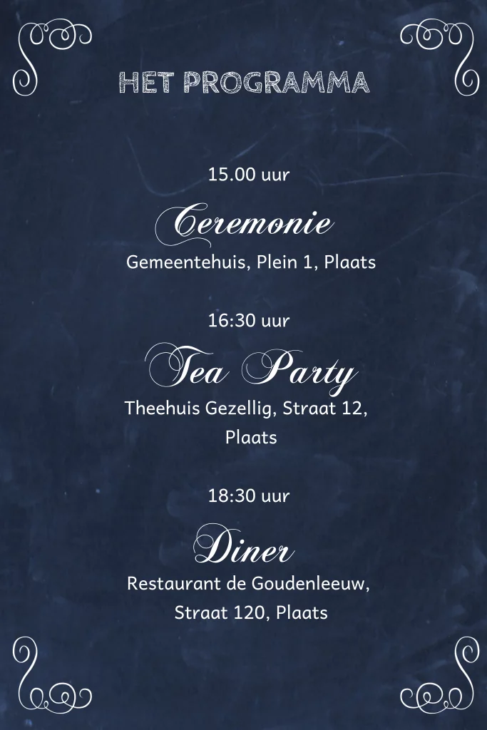 Magazine look trouwkaart met foto en sierlijke letters. Donkerblauwe achtergrond. (579)