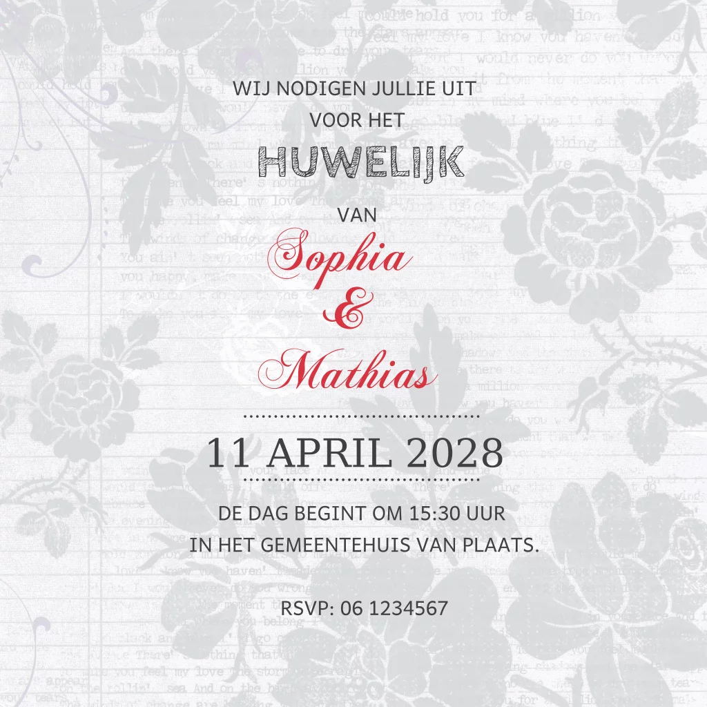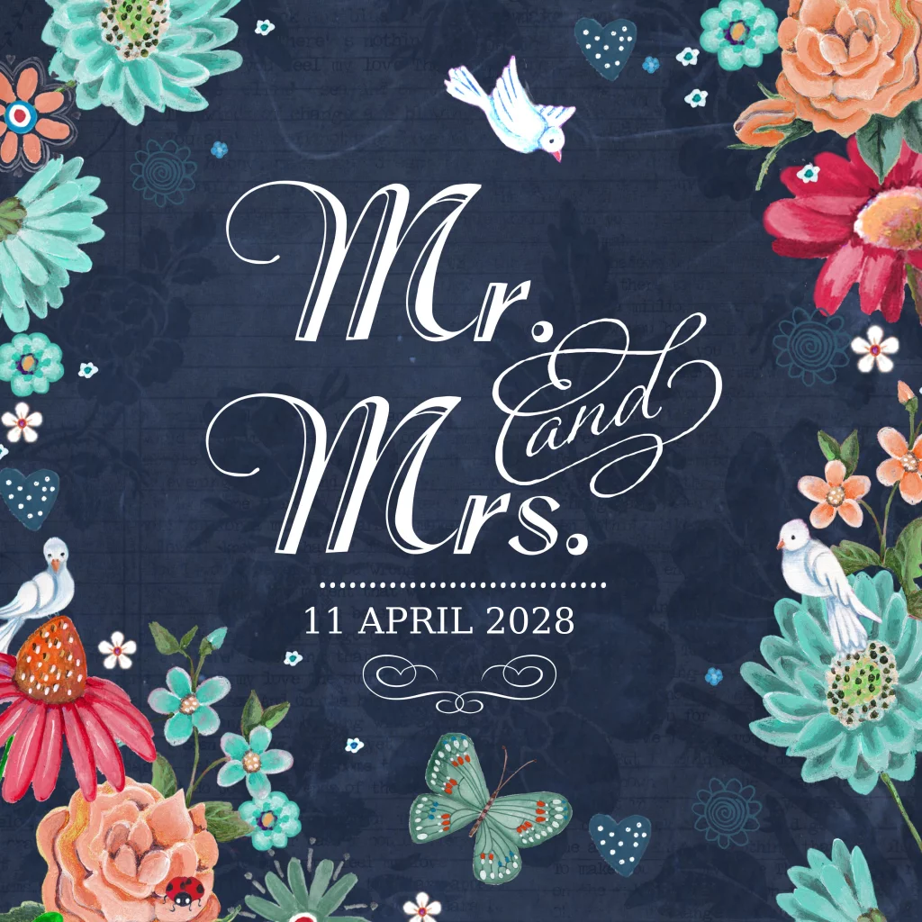 Trouwkaart schoolbord Mr en Mrs met bloemen