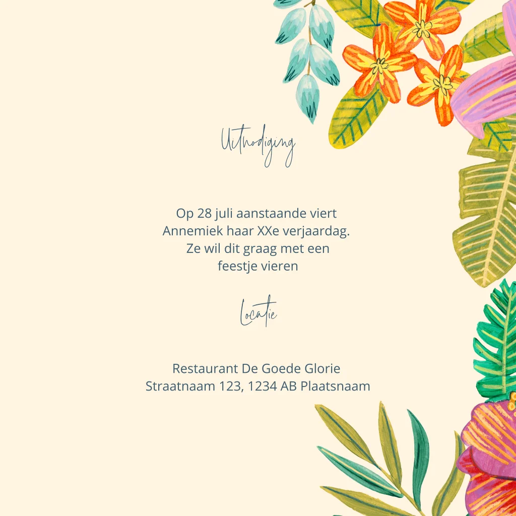 Een mooie uitnodiging voor een verjaardag of ander feestje met tropische bloemen voor bijv. een verjaardagsfeestje in de tuin. (24170)