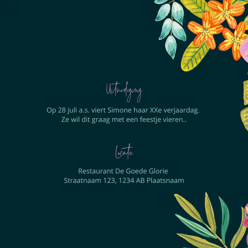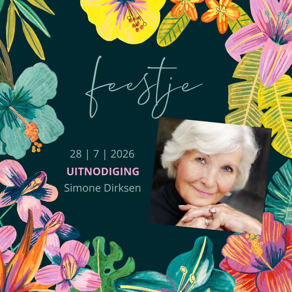 Een mooie uitnodiging voor een verjaardag met tropische bloemen op een donkere achtergrond voor een verjaardag. (24169) De kaart kan ook zonder foto gebruikt worden.
