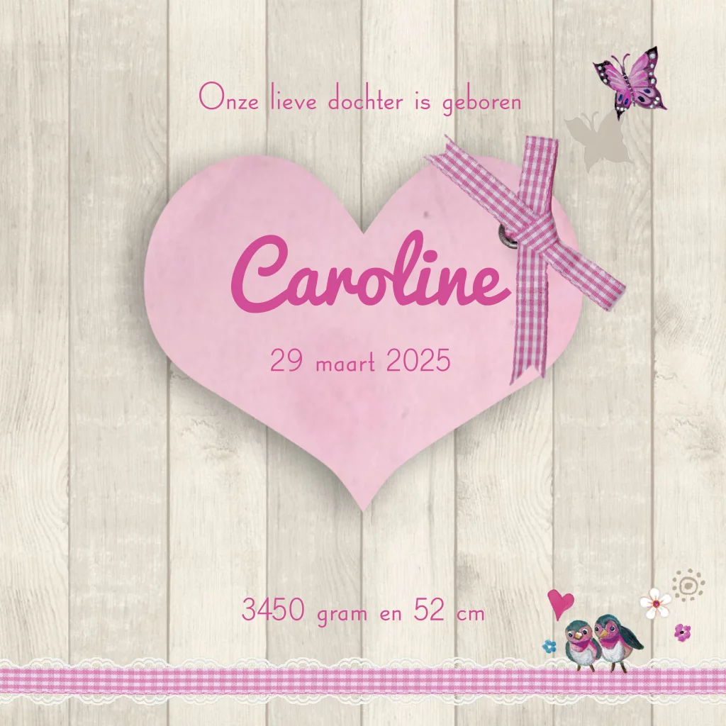 Vlinders geboortekaartjes voor meisjes met grijs hout en paarse vlinders. Turquoise bloemen en roze hartje. (346)