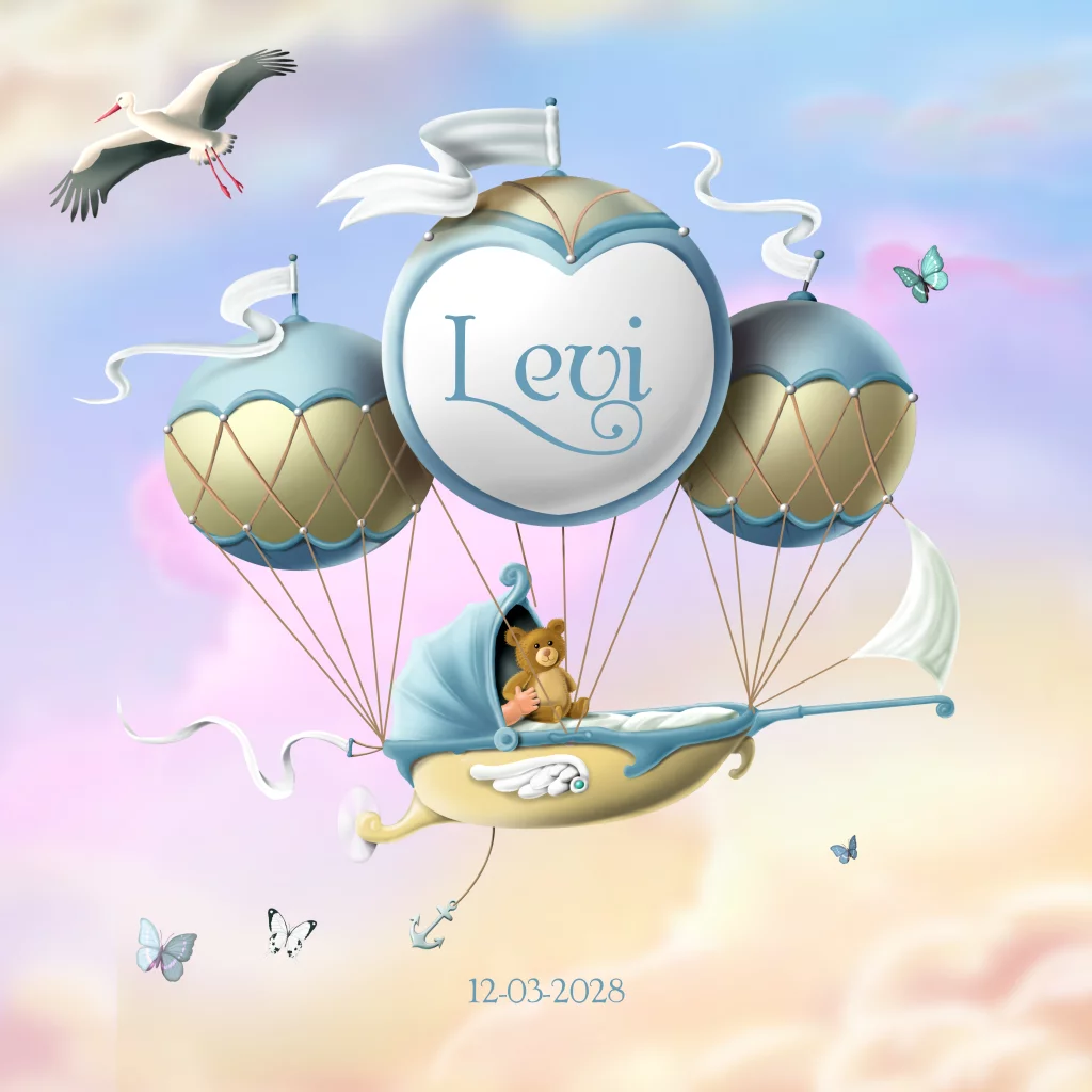 Bijzonder mooi getekend geboortekaartje jongen in sprookjes thema dromerige sferen. Een wieg in hangend aan drie luchtballonnen in pasteltinten (3315)