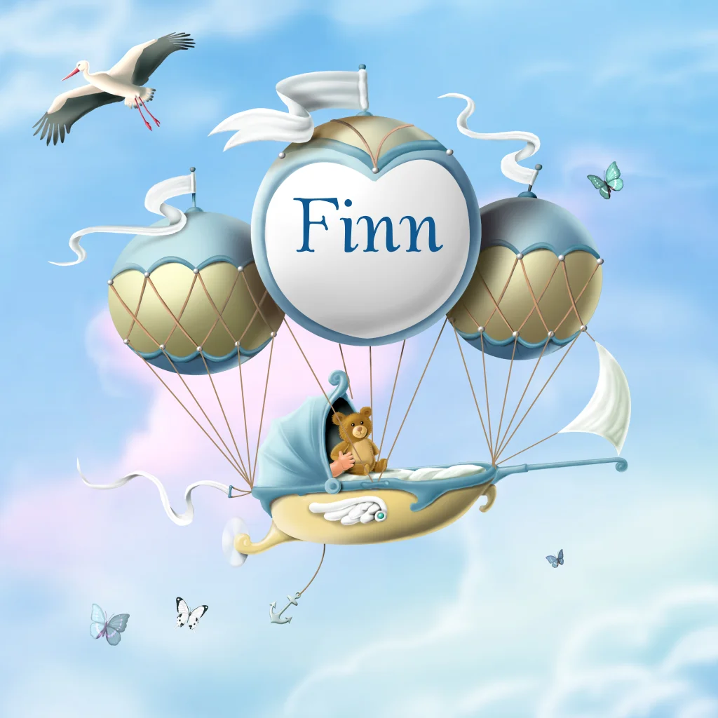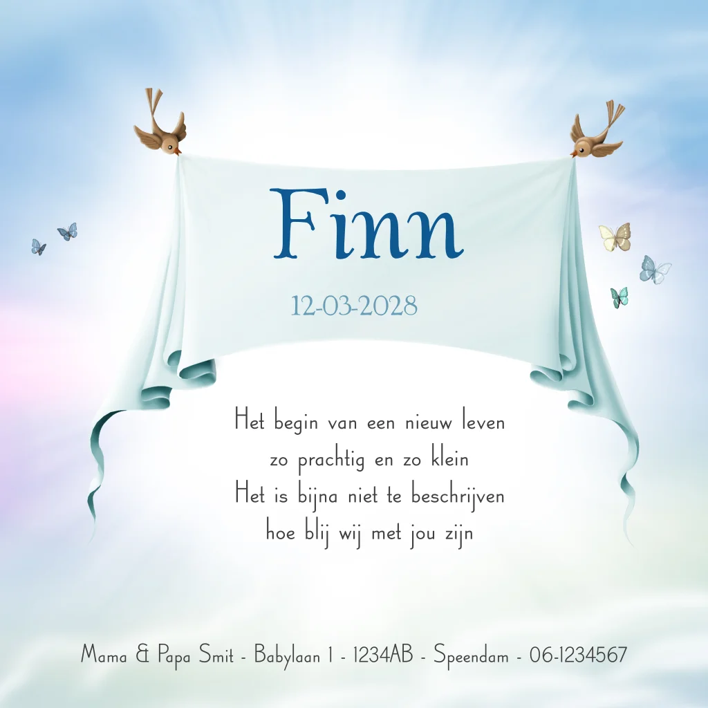 Uniek speciaal geboortekaartje jongens sprookje in pastel blauw. Zwevende wieg met beertje aan luchtballon met ooievaar. (3316)