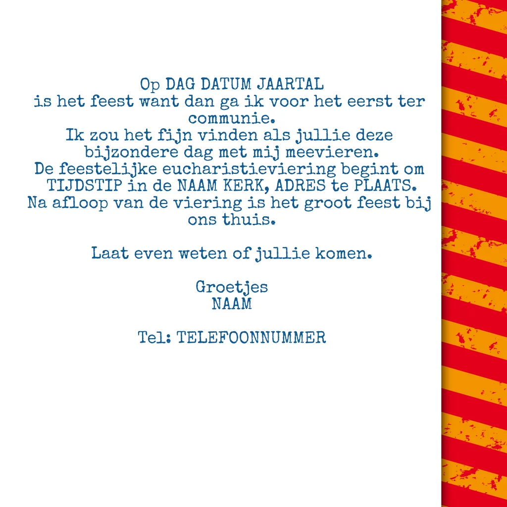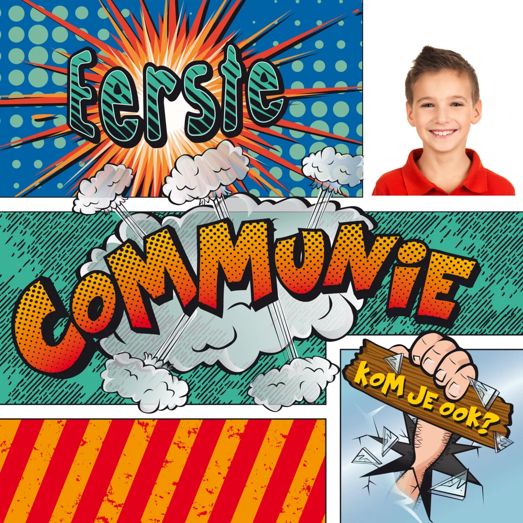 Stoer communiekaartje jongen teksten stripboek en vrolijke kleuren