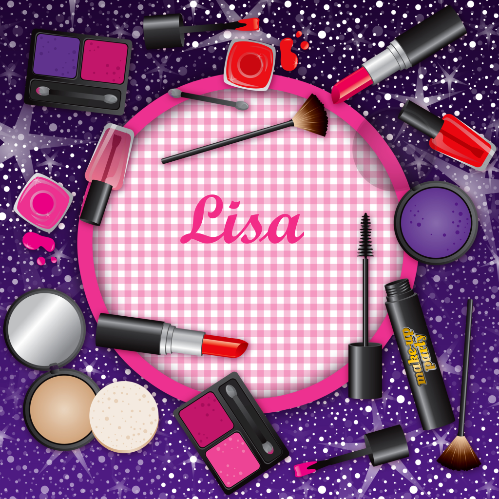 Uitnodiging voor een kinderfeestje jonge meiden. Allerlei make-up op een paarse achtergrond met een roze geruite cirkel in het midden.