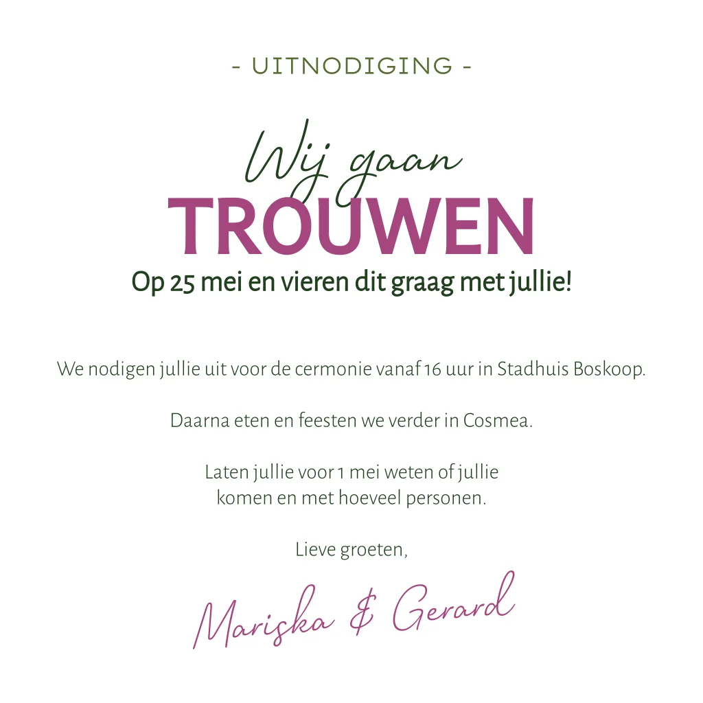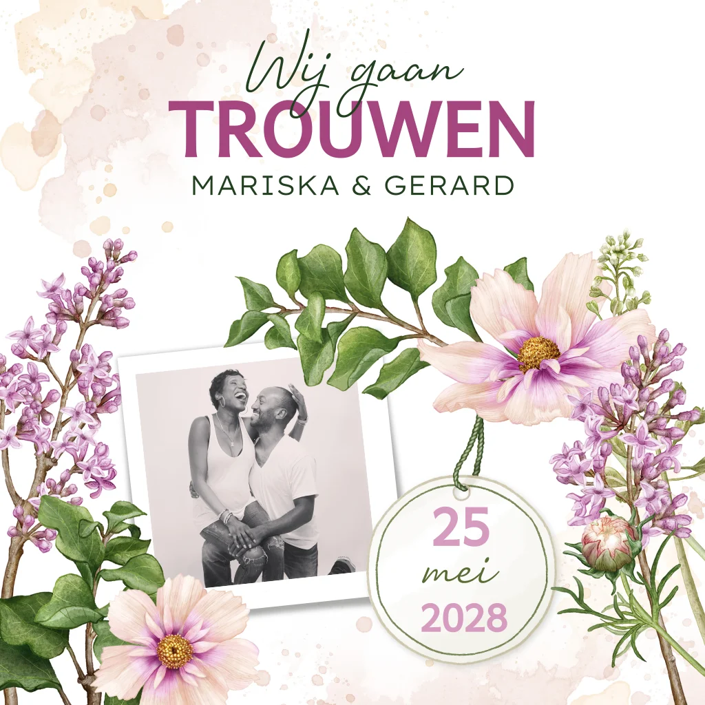 Foto trouwkaart met foto en mooi gekleurde bloemen cosmea en sering in roze en paars tinten.
