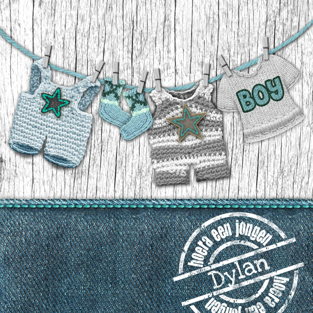 Mooi geboortekaartje met waslijn. Stoere spijkerstof en groot witte stempel op de voorzijde.