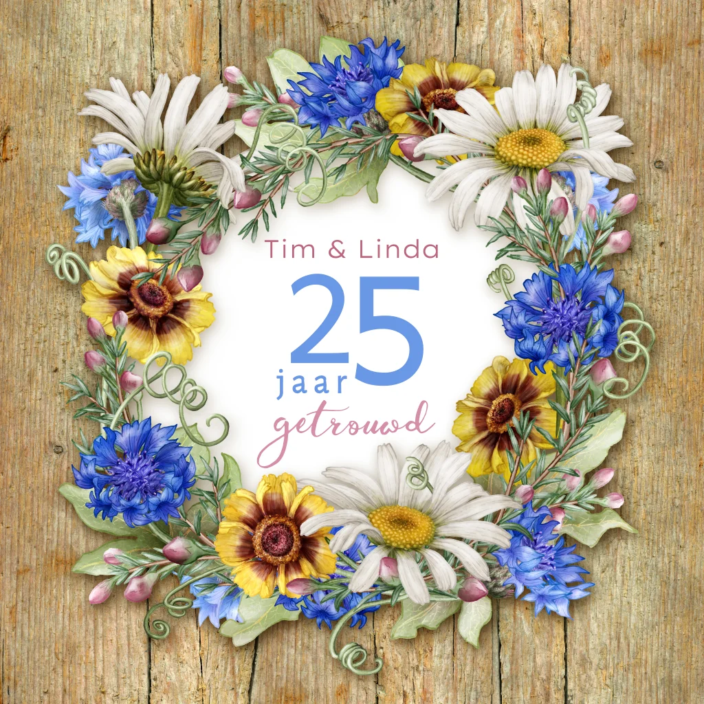 25 jaar getrouwd uitnodiging of ander Jubileum met een bloemenkrans op hout en planken achtergrond.