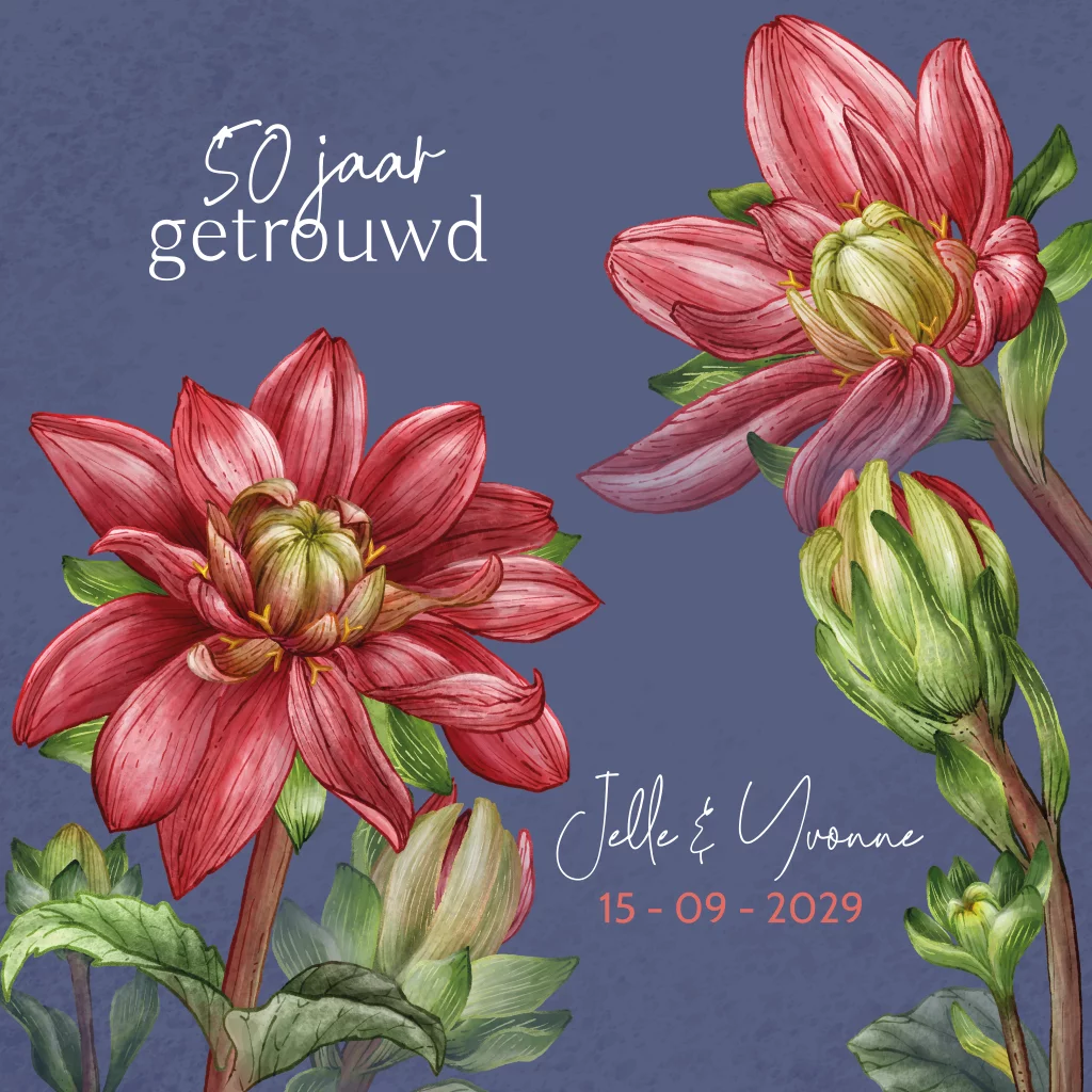 Jubileum 50 jaar getrouwd uitnodiging met dahlia bloemen