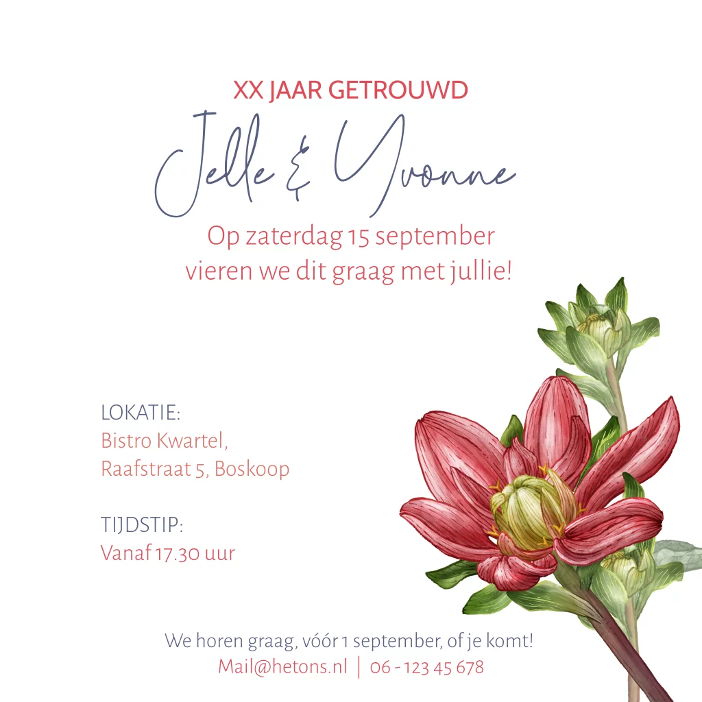 50 jaar getrouwd jubileum uitnodiging met mooie rode Dahlia bloemen. Alle teksten zijn aanpasbaar. (23634)