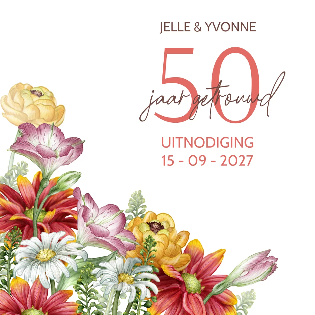 Gebruik deze vrolijke kaart om jullie 50e trouwjubileum te vieren. Met vrolijke bloemen en teksten die je zelf aan kunt passen! (24100)