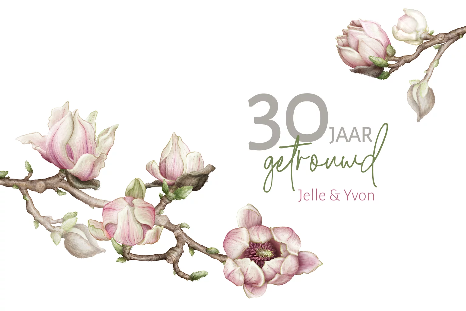 Een sfeervolle kaart om een (trouw) jubileum 30 jaar te voeren. De mooie magnolia tak is zeer gedetailleerd geïllustreerd. De tekst op de kaart is aan te passen naar wens. (24101)