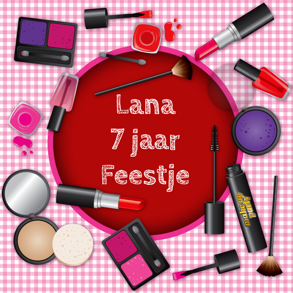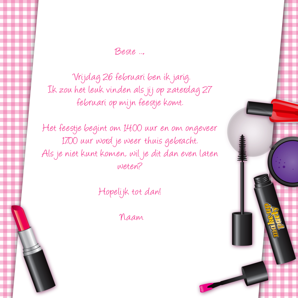 Uitnodiging voor een kinderfeestje met make-up. Roze ruiten op de achtergrond.