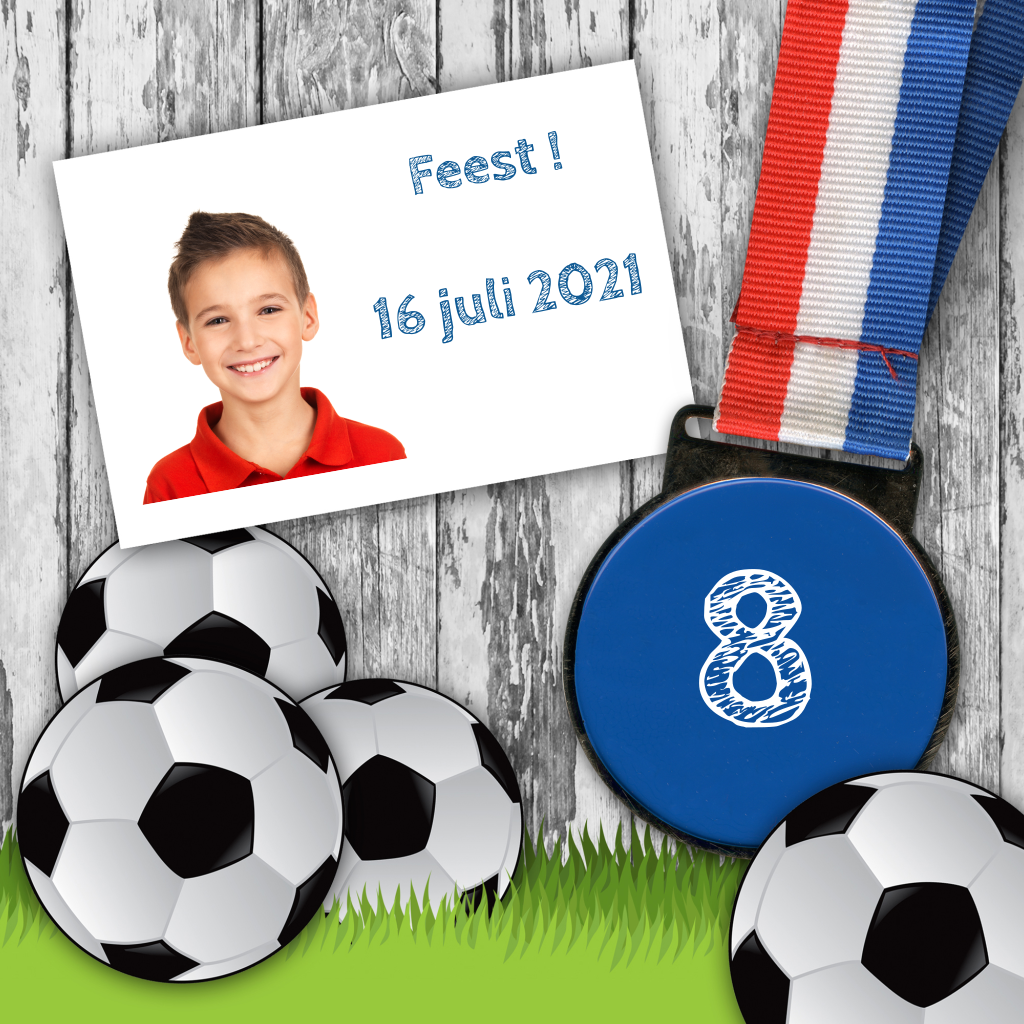 Uitnodigingskaart feestje jongen met voetballen en een medaille