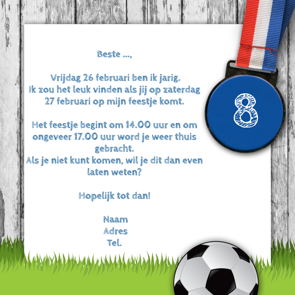 Stoere uitnodiging voor een kinderfeestje met voetballen en een blauwe medaille. Houtpatroon in de kleur grijs op de achtergrond.
