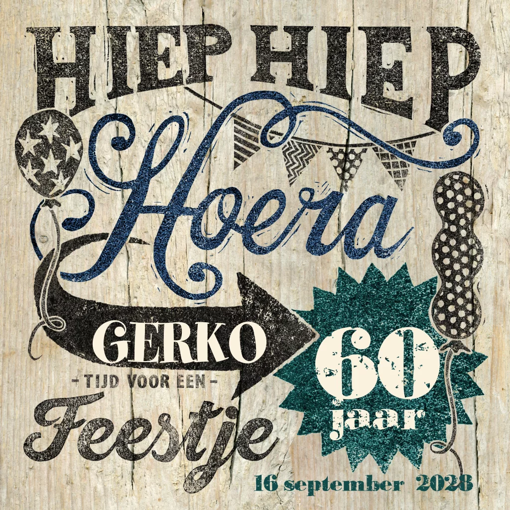 Uitnodiging verjaardagsfeest man 60 jaar op hout met stempels. (7071)
