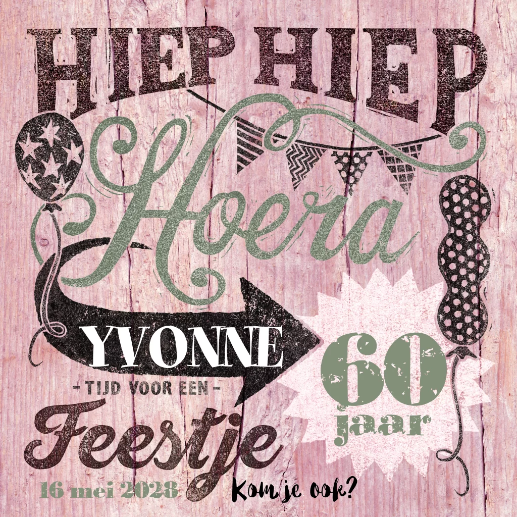 Leuke uitnodiging 60 jaar vrouw op hout met stempels