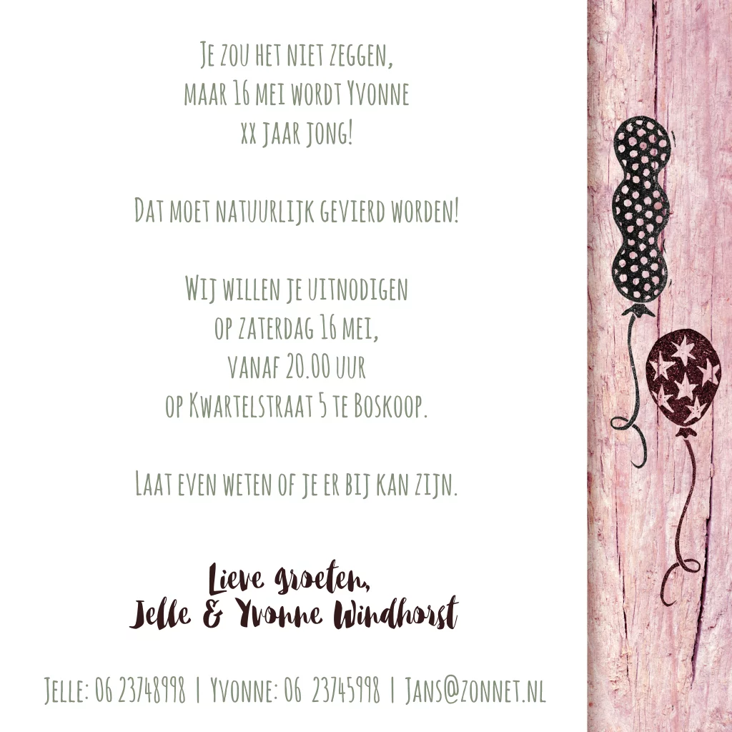 Vrolijke verjaardagsuitnodiging voor een vrouw. Met leuk stempels op roze hout. (7068)