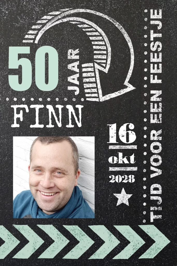 Stoere uitnodiging man krijtbord 50 jaar pijl en stempels