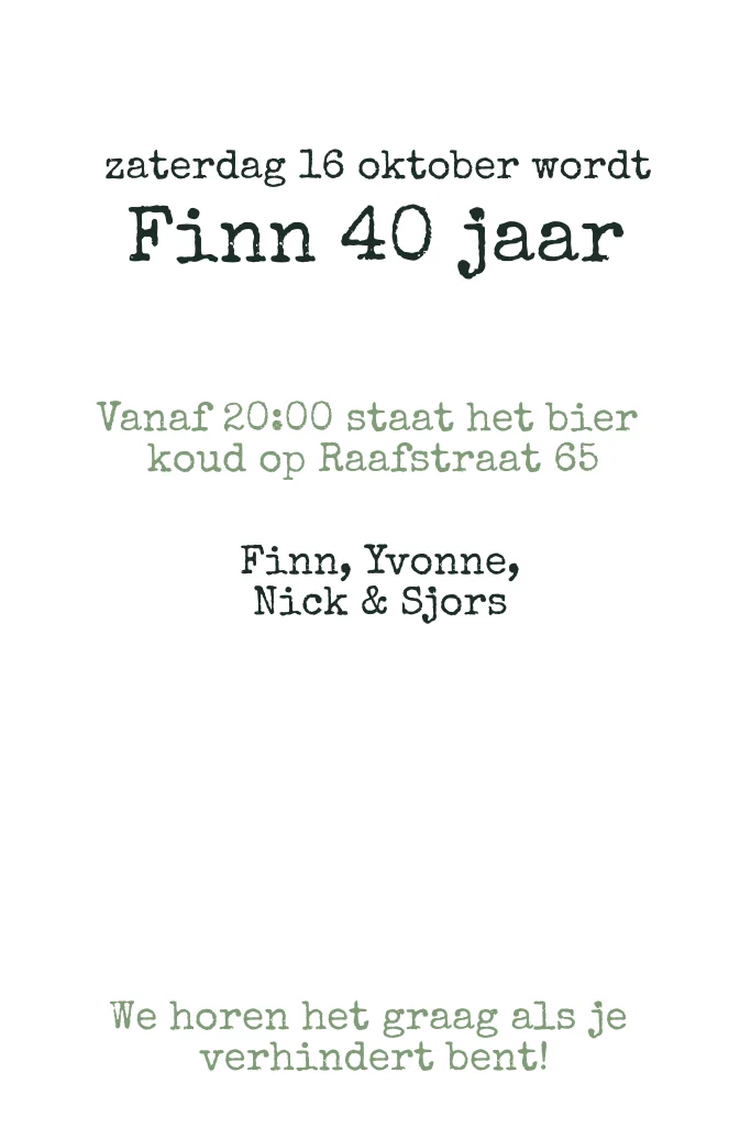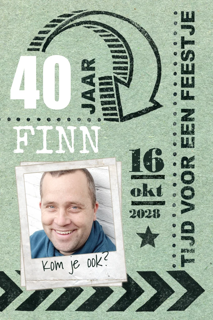 Uitnodiging verjaardag 40 jaar man. Met leuke stempel tekst op oud groen papier. (7072)