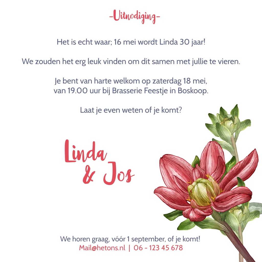 Uitnodiging verjaardag 30 jaar vrouw met kleurrijke Dahlia bloemen