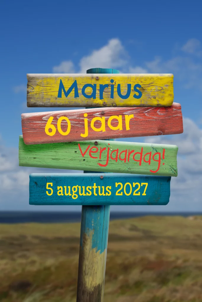 Uitnodigingskaart voor 60e verjaardag met borden van hout in verschillende kleuren. (3045)