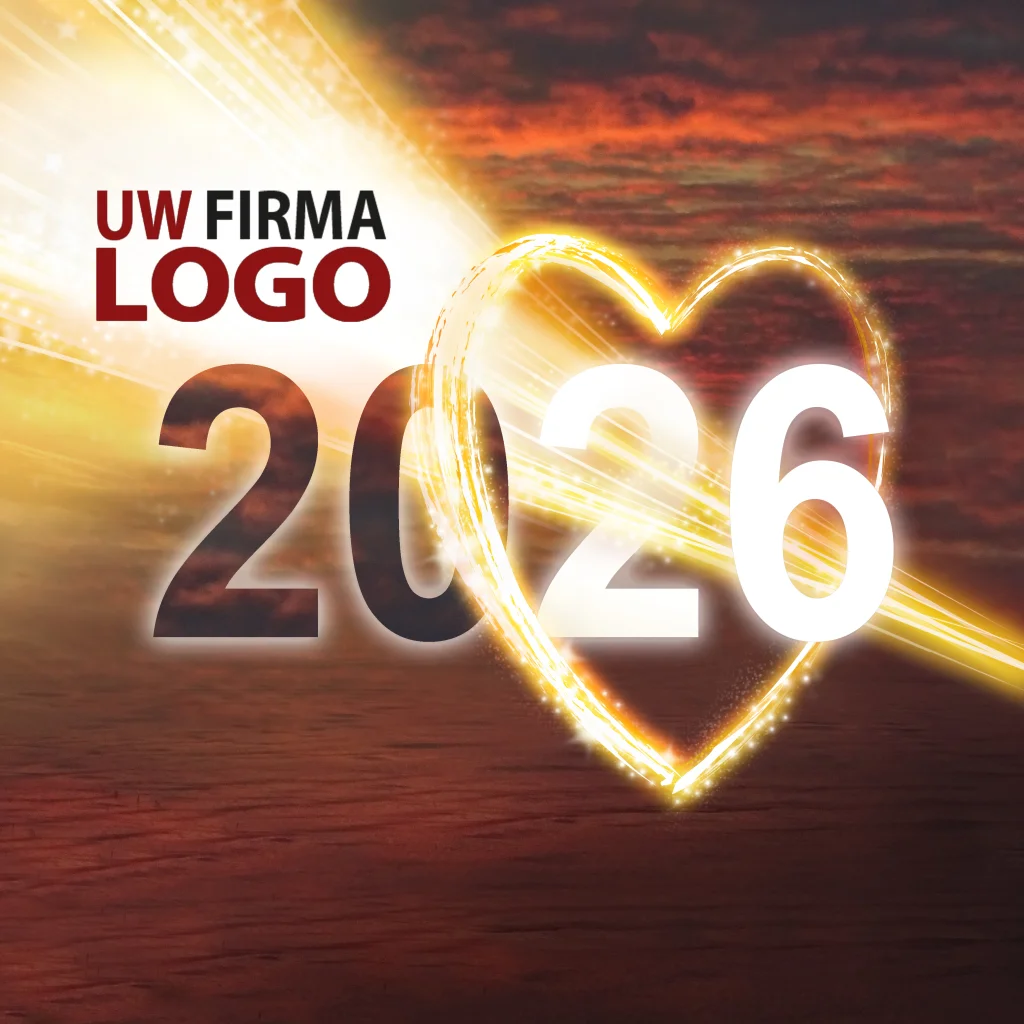 Een sfeervolle kerstkaart met 2026 in een groot lichtgevend hart en bedrijfslogo, pas het ontwerp aan in onze online editor. Je kunt de kaart bestellen in 9 papiersoorten en 3 formaten: 11, 13 en 15 cm. (24736)