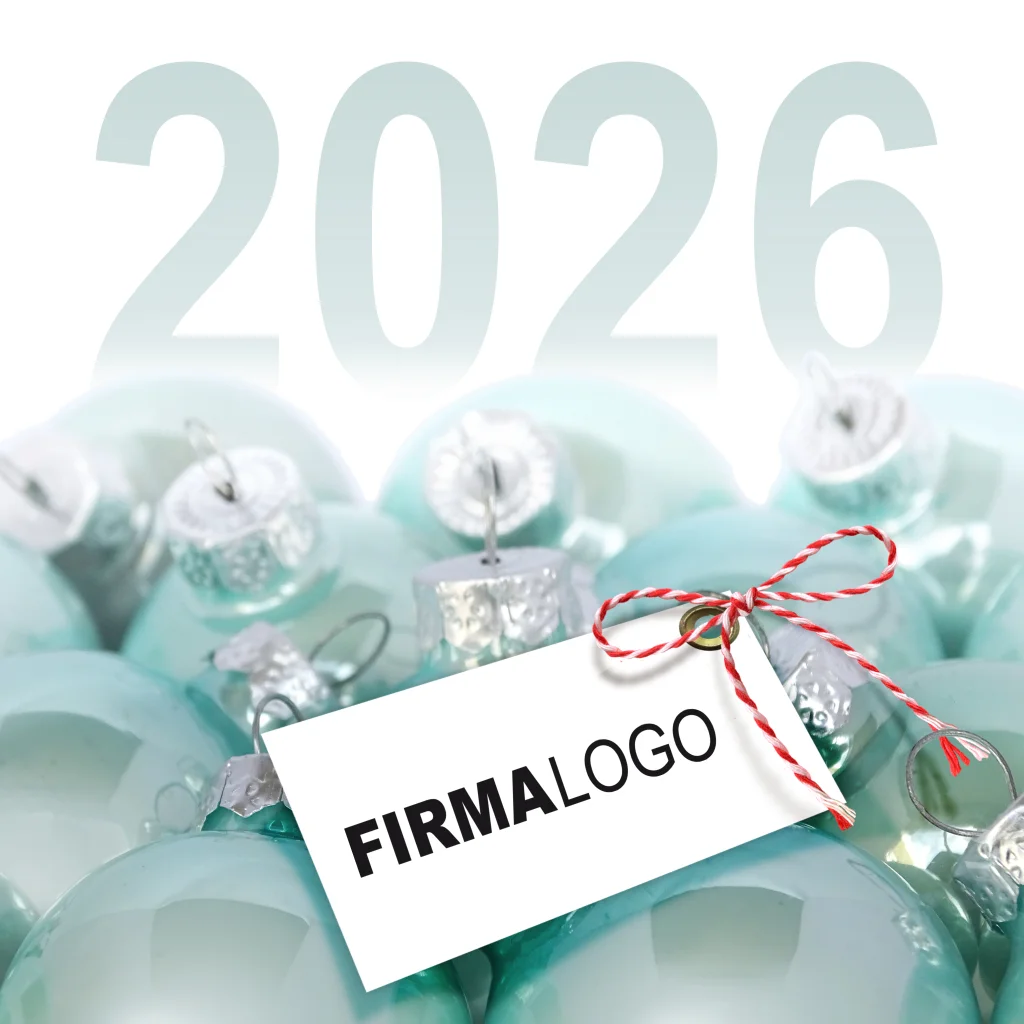 Zakelijke kerstkaart met pastel cyaan groene kerstballen en bedrijfslogo Je kunt de kaart bestellen in 9 papiersoorten en 3 formaten: 11, 13 en 15 cm. (24734)